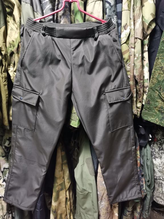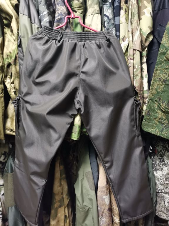 Брюки свободного покроя с притачным поясом на резинке, с 2-мя боковыми и 2-мя накладными объемными карманами с клапанами на кнопках. Вниз брюк вставлен шнур.