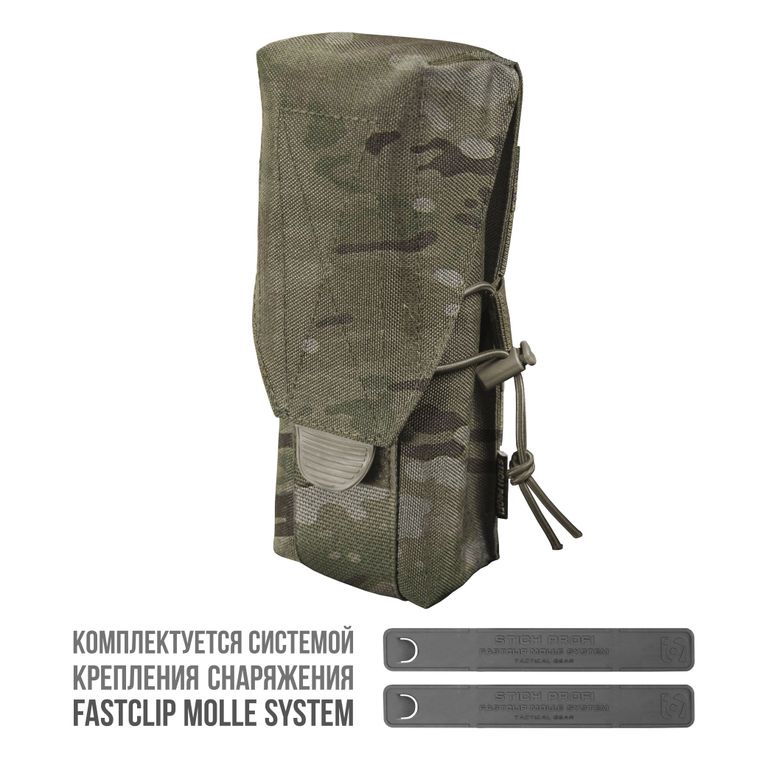 Подсумок предназначен для переноски двух магазинов к автомату Калашникова с креплением на модульные системы MOLLE и аналоги, либо же на тактический ремень шириной 50-55мм. Рассчитан на переноску магазинов 5,45х39мм и магазинов 7,62х39мм. Особенности: - Объем подсумка регулируется посредством утяжки эластичного жгута (шоккорда) регулируемой длины, благодаря чему обеспечивается максимально надёжная фиксация одного, либо двух магазинов. - Запирание подсумка осуществляется при помощи текстильного клапана, боковые стороны увеличены по высоте, благодаря чему обеспечена максимальная защита содержимого от атмосферных осадков. Клапан застёгивается на застёжку велкро, что обеспечивает надёжное и быстрое открывание и закрывание подсумка. - Конструкция клапана обеспечивает более удобное и быстрое открывание благодаря наличию пластикового ребристого язычка. - В нижней части подсумка имеется люверс ,для дренажа атмосферных осадков. - Наличие перегородки из текстильной стропы повышенной прочности (размещена на клапане) позволяет исключить демаскировку пользователя шумом при переносе. - Подсумок компактен, адаптирован под быстрое и удобное извлечение магазинов. - Закрепляется при помощи двух пластиковый креплений FAST CLIP MOLLE SYSTEM (идут в комплекте) на снаряжение, ,которое имеет стропы MOLLE – будь то модульные нагрудники, РПС, разгрузочные ремни типа warbelt или же набедренные разгрузочные системы. - Предусмотрена возможность фиксации на тактические полевые ремни шириной 50-55 мм. - Благодаря новой конструкции удалось снизить общий вес подсумка, что в конечном итоге, положительно скажется на общем весе вашей разгрузочной системы. В целом, данный подсумок отлично подойдёт для самых требовательных пользователей, который нужен качественный подсумок для переноса боеприпасов.