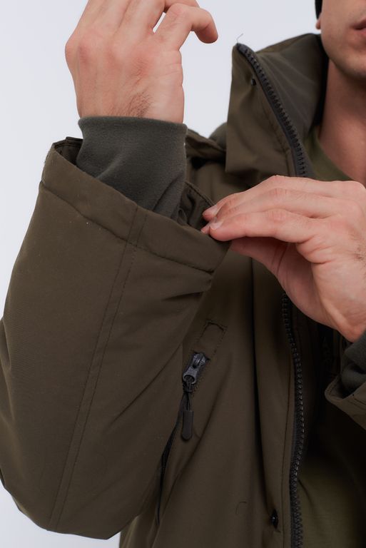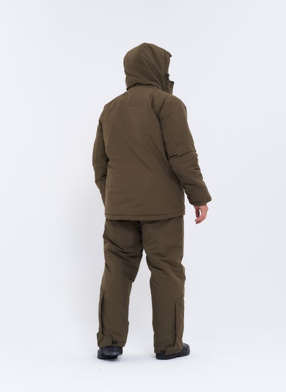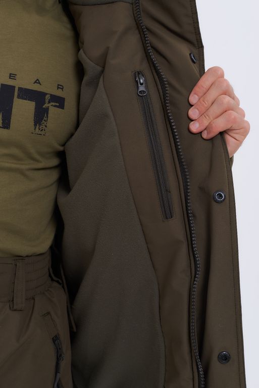 Воротник и капюшон отделаны флисом. На рукавах имеются тряпичные манжеты. Отстёгивающийся капюшон. Брюки без спинника. Флисовый подклад. Водонепроницаемая ткань. Эргономичный крой. Внутренний карман.