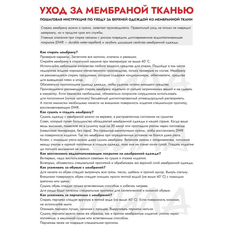 Наружная ветронепроницаемая и водостойкая ткань куртки помогает поддерживать микроклимат внутри и, по мере того как влага транспортируется с внутренней поверхности, она подхватывается наружной тканью, которая впитывает её как промокашка, перенося её на наружную поверхность, откуда она очень быстро испаряется в окружающее пространство.